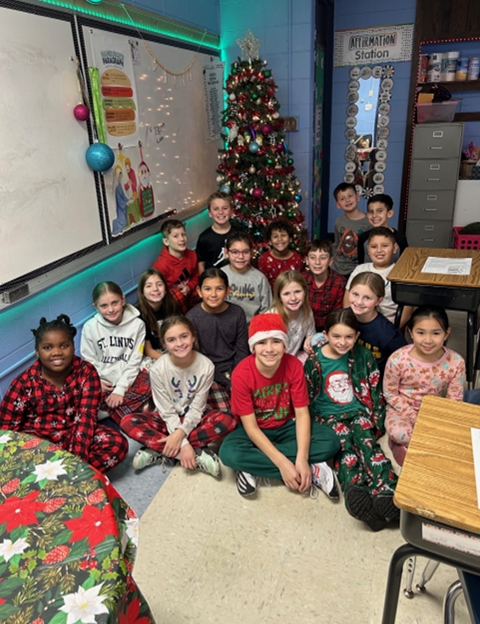 Here is Mrs. Bourjas’ 4th Grade Class showing off their pj’s and wishing everyone a Merry Christmas!