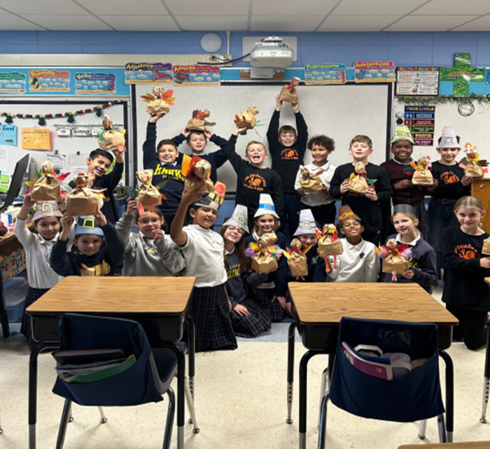 Here is Mrs. Bourjas’ 4th Grade Class showing off their Turkey Art Projects