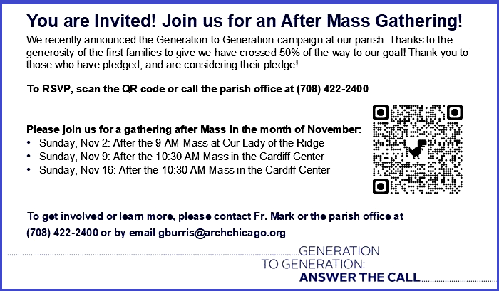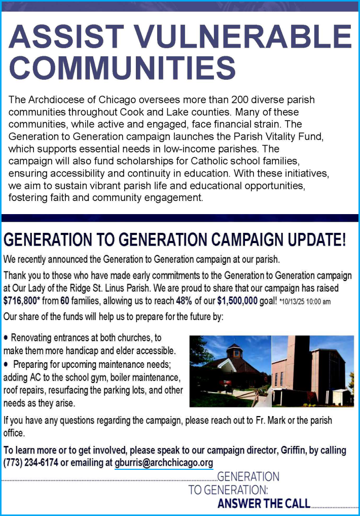 Giving of our treasure is also an important commitment. Your support either through Sunday collections, participation in fund raising events or remembering Our Lady of the Ridge - St. Linus Parish in your will are important building blocks for the programs, facilities and functions of our parish and school.