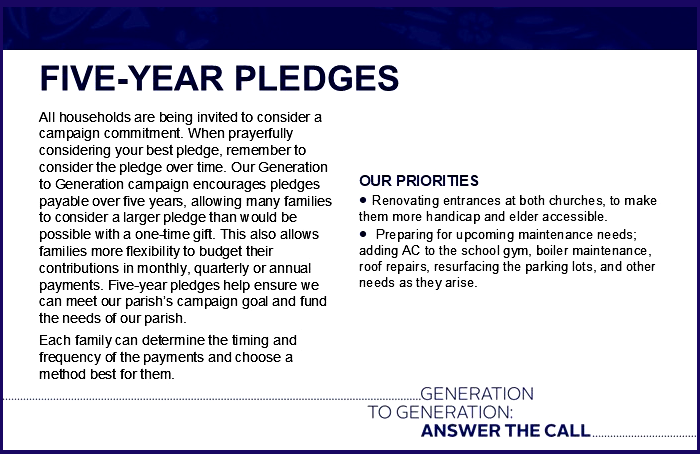 If you would like to make a commitment today, our online payment partner is GiveCentral.org, a secure interface for making donations to our parish by electronic check or your credit card (Visa, MasterCard, Discover or American Express).