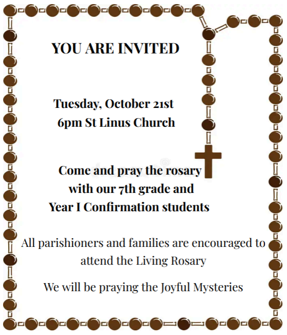 The rosary is said each weekday after the 7:30 am Mass at St. Linus Church and at 7:45 am before the 8:30 am Mass at Our Lady of the Ridge Church.