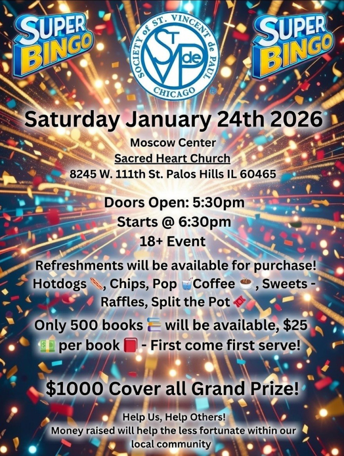 We reach out to all parishioners young and old to consider helping our St. Vincent de Paul Conference in our many activities. Please send us an email at Meslar5@att.net or contact the Parish Reectory Office at 708-422-2400 if you are interested in becoming a member of our Conference or interested in helping at our Food Pantry. I can honestly say if you spend an hour or two with us, we guarantee you won’t regret it. Stop by for a visit and see our volunteers at work at our Food Pantry, second Saturday of the month between 7 am and 10 am at Our Lady of the Ridge Gym.