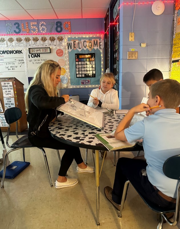 Here is Ms. Pizur doing small group work with three of her Fourth Grade Students.