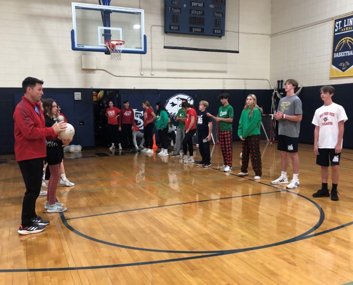 Here is Mr. Dillon with the 8th Grade Students teaching them a new PE Activity.