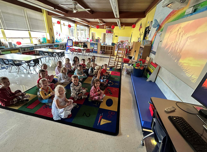 Here is one of our preschool classes enjoying their movie in the comfort of their pj’s!